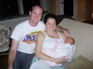 Emma was weighed, cleaned off, had some mommy and daddy bonding time and then whisked off to the nursery to get her first bath. Trav followed Emma to the nursery and my mom came in to our room to keep me company. I had started feeling like I was going to pass out. My mom got very concerned b/c I was getting very pale and she went out to get the nurse. When the nurse came in she took my blood pressure and it was 54/32---not real good. Long story short...turns out that I had a postpartum hemorrhage and had to be taken into the operating room for a D and C to scrape/clean out my uterus so that the bleeding would stop. It had all happened sooo fast and was so surreal b/c the labor and delivery had gone by without a hitch and now everything had taken a turn for the worse. After the procedure I felt much better and my color had returned and blood pressure had improved. I was given medicine to make sure the bleeding was under control and to make my uterus contract and firm up to prevent any more bleeding. I was moved to a postpartum room at 1o:45pm and was watched closely through the night. I got to hold Emma for only the 2nd time at 2am for her first feeding from me. I was weak and sore, but that moment was precious and I was thankful that things had turned out ok. The nursing staff was great, took care of us and made sure that I was getting better. We were discharged a little after 12pm on Friday---Emma's original due date. Going home was a much needed break from the drama and the interruptions that occurred over the last couple of days and nights.